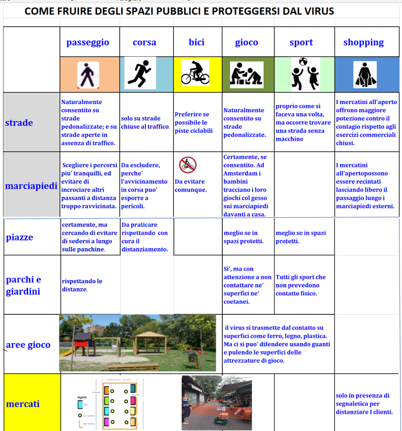 Fruire dello spazio pubblico, anche solo passeggiando, ci fa bene; disperde la concentrazione di virus; e rinforza la difese immunitarie. Ma bisogna farlo tutelando la propria salute. Questo schema riporta i comportamenti da seguire nelle varie modalità di fruizione dello spazio pubblico (passeggio, corsa, bici, gioco, sport, shopping…) nei diversi tipi di spazio pubblico (strade, marciapiedi, piazze, parchi e giardini, aree gioco, mercati….)