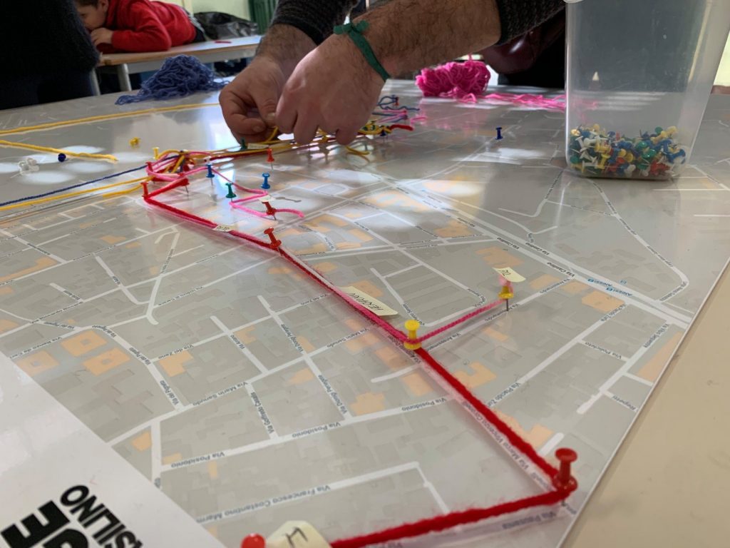 La narrazione dello spazio del quotidiano – che sarà restituita dai bambini e dalle bambine attraverso eventi pubblici gestiti e coordinati da loro – procede da una consapevolezza del valore del territorio che non è frutto di categorie ma di un pensiero intuitivo. Le connessioni, la narrazioni, i punti di vista non mettono in fila i concetti che ci si affanna a sistematizzare per trasmetterli nel modo “giusto”, ma procedono secondo logiche totalmente nuove, come dicevamo sganciate da strutture e teorie.