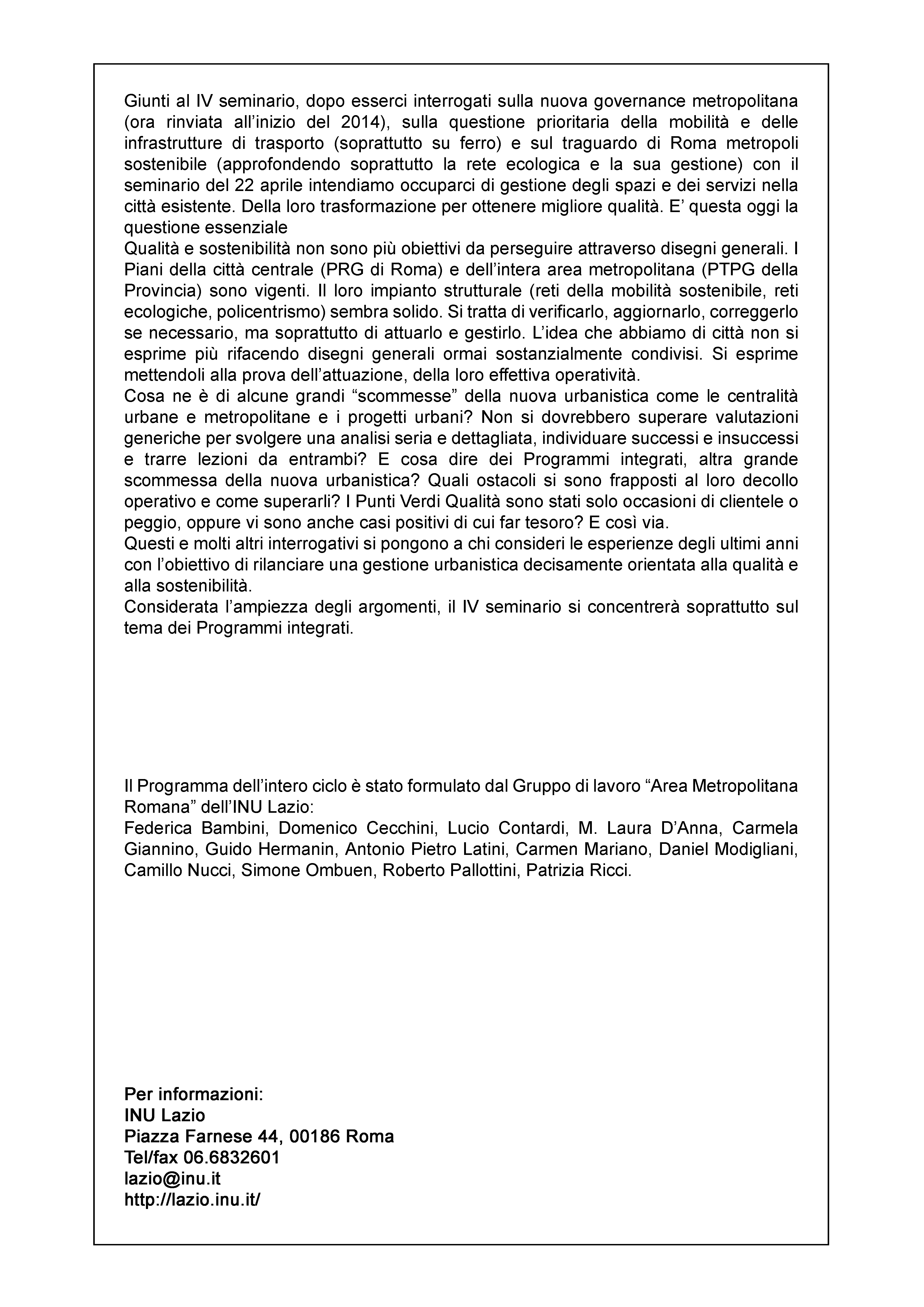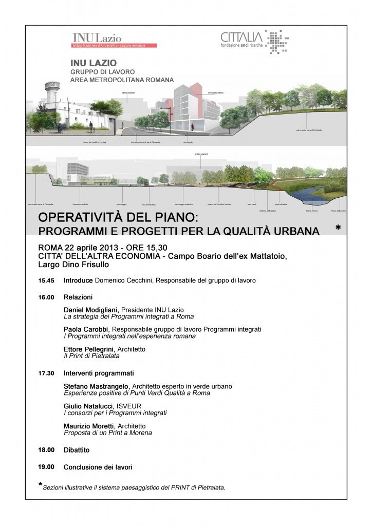 il 22 aprile a Roma alla Città dell’altra Economia in piazza Frisullo (ex mattatoio) si svolge dalle 15,30 il seminario organizzato dal gruppo di lavoro ” area metropolitana_” di INU Lazio sul tema “operatività del piano: piani e progetti per la qualità urbana