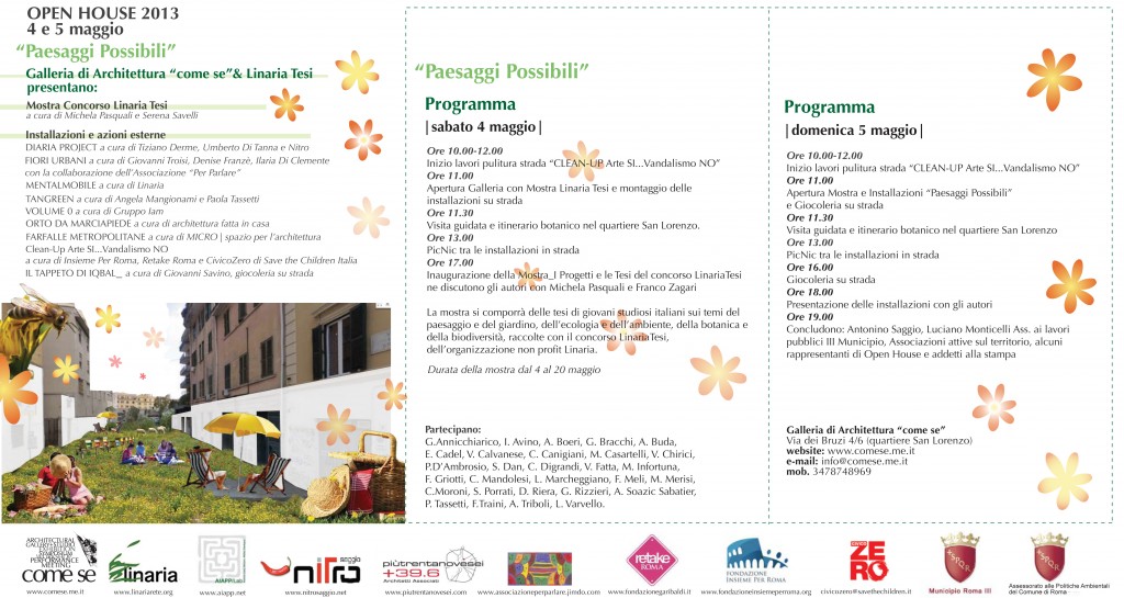 La galleria “Come se” propone in occasione di Open House 2013 due giorni ricchi di eventi, installazioni e mostre sul tema del paesaggio. All’esterno verranno realizzate otto installazioni a spazio verde temporaneo per vedere con occhi diversi spazi che altrimenti rimarrebbero anonimi ritagli urbani. All’interno dalle ore 17 del 4 maggio inaugurazione della mostra “Paesaggi Possibili” che durerà fino al 20 maggio, presentazione delle installazioni con gli autori e gli interventi di Michela Pasquali e Franco Zagari.