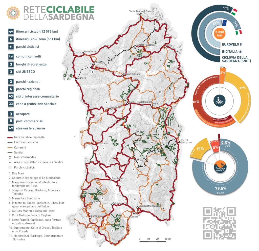 L’idea di una rete di itinerari ciclabili che renda l’isola interconnessa e percorribile in bicicletta nasce dalla considerazione di alcune peculiarità della Sardegna contemporanea: le caratteristiche climatiche, la diffusione capillare di attrattori naturali e storico-culturali, la configurazione insediativo-demografica diffusa dei territori e le possibilità di sviluppo connesse all’economia del tempo libero e del turismo sostenibile, oltre alla presenza di un sistema infrastrutturale in disuso e in attesa di rigenerazione.