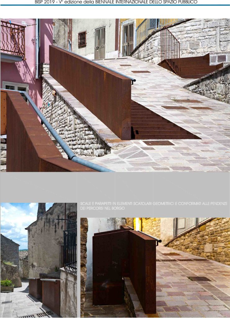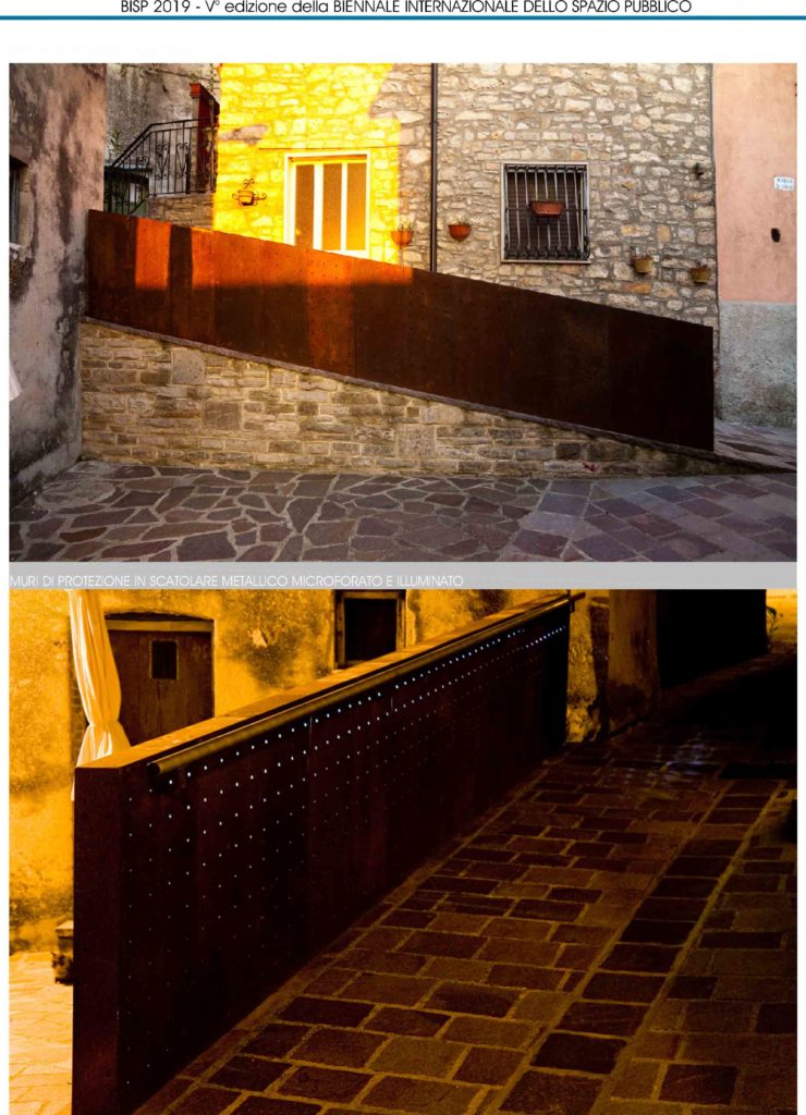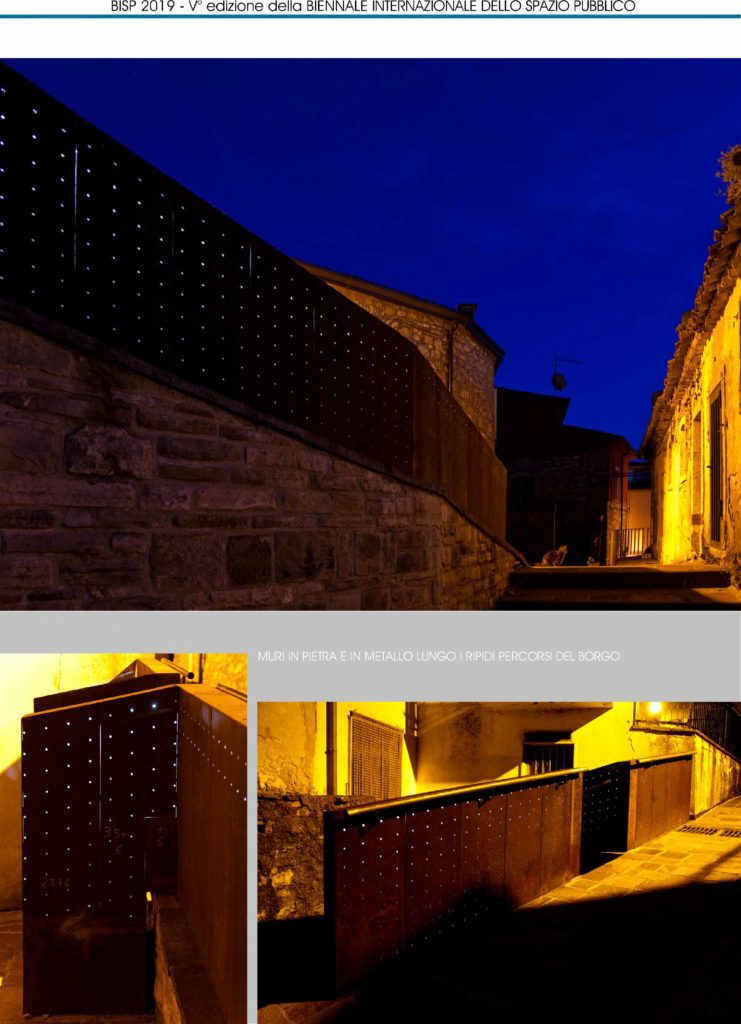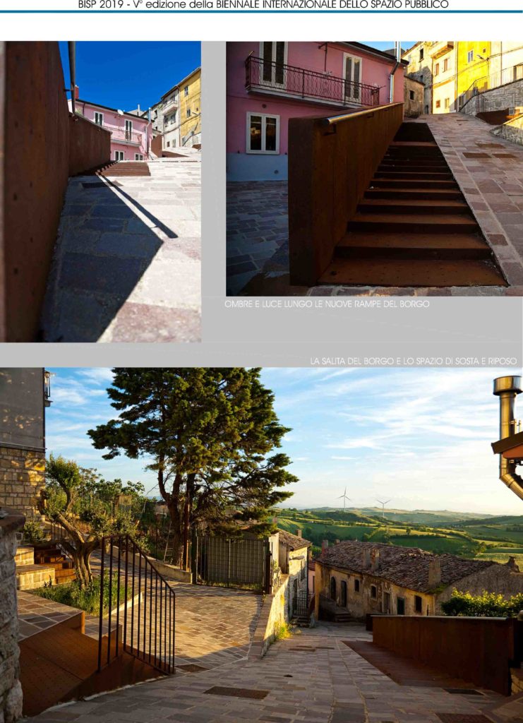 L’intervento è ubicato nel comune di Monteleone di Puglia (Fg) e interessa il “Borgo Nuovo” primo nucleo di espansione fuori le mura, con isolati articolati secondo l’andamento acclive del terreno, prospicienti la vallata sottostante. L’intervento riguarda la riqualificazione di via Borgo Nuovo e la sistemazione della salita di attraversamento del Borgo verso il centro storico, con uno spazio di sosta e riposo. Il percorso di attraversamento del Borgo Nuovo ha un tracciato in forte dislivello altimetrico, con pendenza del 20%. Le scale lineari con parapetti, protezioni, corrimano, consentono una mobilità pedonale agevolata, soprattutto in caso di piogge e formazioni di ghiaccio superficiali ed una migliore fruizione da parte della popolazione con alto tasso di vecchiaia. Sono elementi scatolari, geometrici, conformati allo stato dei luoghi e ripetibili, con pedate, alzate e parapetti in lastre di acciaio corten microforate e retroilluminate. I caratteri architettonici e scultorei delle nuove rampe del Borgo, con il reticolo geometrico dei microfori luminosi, ne assimilano l’immagine ad installazioni di arte urbana permanente che ripropone, ogni giorno, un dialogo tra città e paesaggio, nel mutare delle ombre e della luce. L’opera si riferisce ad un uso della luce come generatrice di effetti di chiaro-scuro, nella definizione dei volumi e dello spazio pubblico interessato e la luce, naturale ed artificiale, si rivela il materiale proprio della costruzione architettonica.