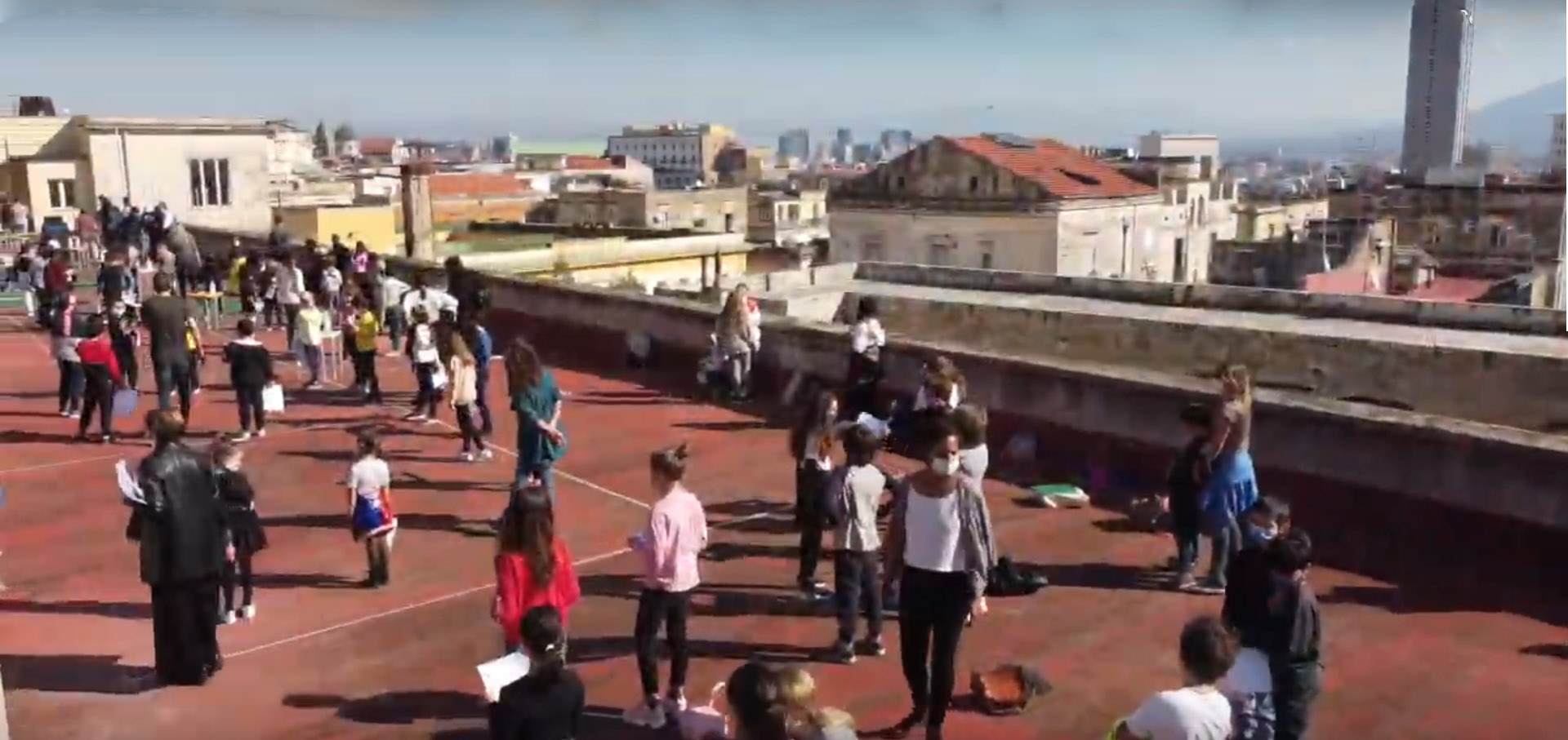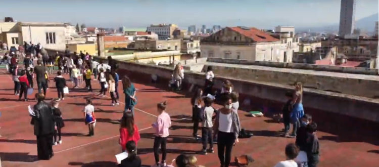 Nei Quartieri Spagnoli di Napoli l’esigenza di vivere lo spazio esterno all’abitazione diviene fondamentale specie se in 30 mq di casa abita una famiglia con membri di età diversa ed esigenze differenti. Per venire incontro alle famiglie e alle esigenze dei ragazzi, andando oltre i limiti della didattica a distanza, in certi contesti improponibile per assenza sia di spazi domestici idonei, sia di mezzi tecnologici, i docenti della scuola d’infanzia Dalla Parte Dei Bambini e della scuola secondaria di I grado Scuola Diffusa hanno portato “fuori” la scuola, sfruttando le potenzialità degli spazi pubblici del rione, organizzando le lezioni per le strade del quartiere, nelle piazzette, sulle scalinate, dai balconi o sulla terrazza dell’ex monastero che ospita questi istituti paritari. Queste due scuole infatti fanno parte di FOQUS, Fondazione Quartieri Spagnoli onlus, un progetto di ben ampio respiro, che partendo proprio da uno spazio vuoto e privo di funzioni (i 10.000 mq dell’ex Istituto Montecalvario) ha creato un hub vitale che andasse a colmare le carenze di un quartiere fragile come quello in cui si trova.