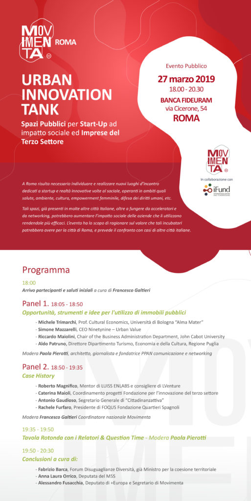 il 27 Marzo dalle ore 18.00 alle 20.30 in via Cicerone, 54 – Roma si svolgerà l’incontro: URBAN INNOVATION TANK – Spazi Pubblici per Start-Up ad impatto sociale ed Imprese del Terzo Settore