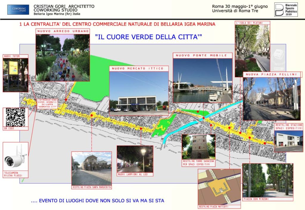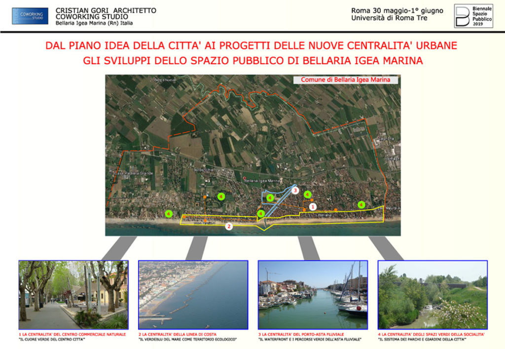 Il lavoro svolto riguarda l’elaborazione di un Piano Idea per definire un “Pensiero di città” e successivamente sviluppare in modo coordinato i seguenti progetti urbani: 1) La centralità del centro commerciale naturale, 2) La centralità della linea di costa, 3) La centralità del porto-asta fluviale, 4) La centralità degli spazi verdi della socialità. Tutti i progetti urbani si configurano con un master plan, dove si è cercato di esplicitare l’idea mediante un “immagine struttura” per tradurre nello spazio fisico i nuovi orientamenti economici, sociali e culturali di Bellaria I.M. La rigenerazione dello spazio pubblico diviene l’elemento primario per affermare le centralità urbane, attraverso le quali poi configurare un nuovo disegno organizzativo della città. Un processo contemplato su due livelli: la flessibilità di adeguare nel tempo gli spazi fisici alle esigenze e la capacità di accogliere molteplici interventi alle diverse scale di progettazione. Un processo evolutivo da integrare con ulteriori progetti per costruire l’ idea di città che Bellaria I.M. intende perseguire in futuro. Un percorso dove attraverso la valorizzazione dello spazio pubblico si riescano ad esaltare i valori delle differenze e garantire il senso di appartenenza alla comunità. L’architettura e l’urbanistica come strumento per favorire i rapporti di convivenza, di socializzazione, di libertà e democrazia. I luoghi dello spazio pubblico come emblema di civiltà.