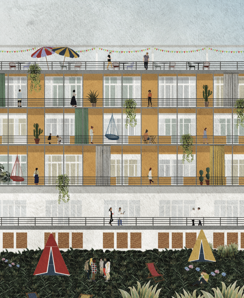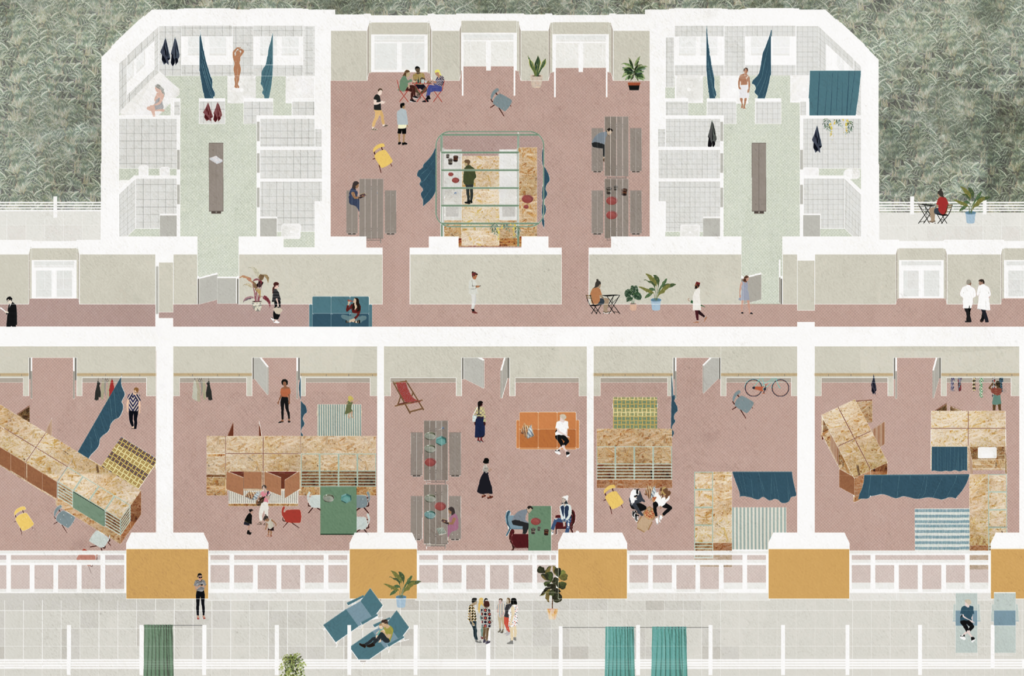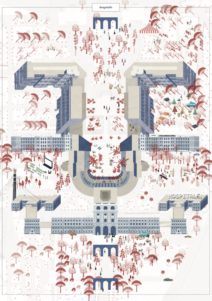 La proposta progettuale di Eleonora Rieti, Mirta Ottaviani e Ilaria Mattioli, tre ex studentesse della facoltà di Architettura di Roma Tre, pone l’attenzione sul riuso della struttura derelitta dell’ospedale San Camillo Forlanini di Roma, con un intervento di uso temporaneo degli ambienti e l’inserimento per fasi di diverse funzioni adatte a convivere nella struttura preesistente.