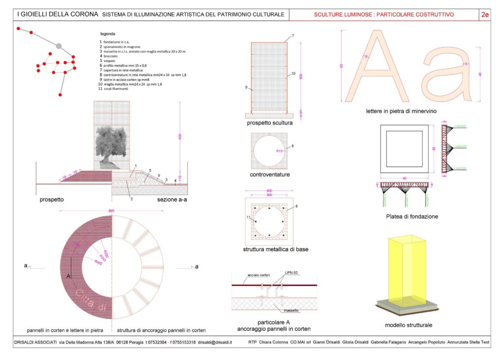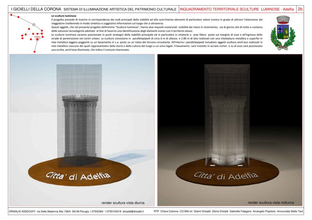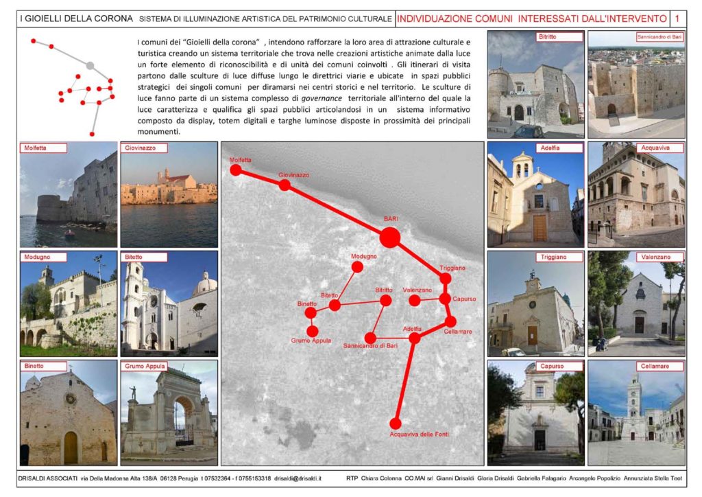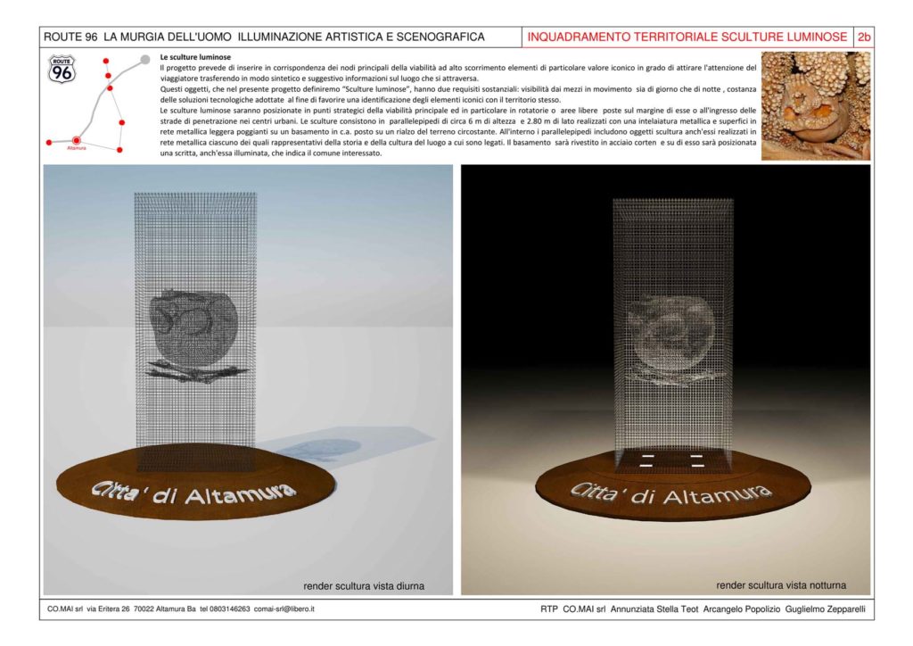 I comuni dei “Gioielli della corona” e della “Route 96”, intendono rafforzare la loro area di attrazione culturale e turistica creando un sistema territoriale che trova nelle creazioni artistiche animate dalla luce un forte elemento di riconoscibilità e di unità dei comuni coinvolti . Gli itinerari di visita partono dalle sculture di luce diffuse lungo le direttrici viarie e ubicate in spazi pubblici strategici dei singoli comuni per diramarsi nei centri storici e nel territorio. Le sculture di luce fanno parte di un sistema complesso di governance territoriale all’interno del quale la luce caratterizza e qualifica gli spazi pubblici articolandosi in un sistema informativo composto da display, totem digitali e targhe luminose disposte in prossimità dei principali monumenti. La proposta artistica diventa elemento di sintesi dei caratteri identitari dei singoli comuni che all’interno di un linguaggio unificato e replicabile possono esprimere la loro peculiarità storica e culturale. I temi delle sculture, realizzate con rete metallica poggiante su un basamento in c.a. rivestito in acciaio corten, saranno scelti dai singoli comuni e saranno oggetto di un incarico apposito coinvolgendo artisti internazionali e locali.