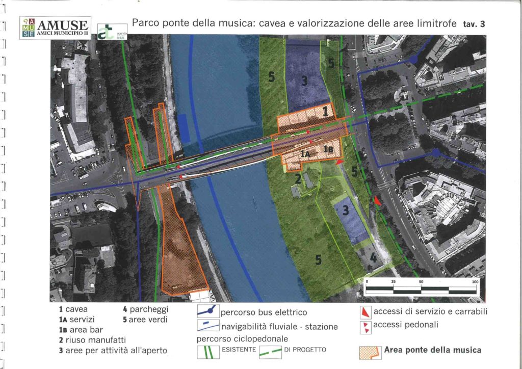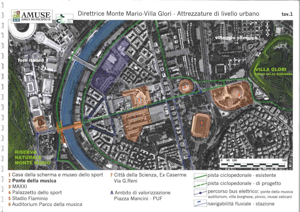 L’area del Parco del Ponte della Musica costituisce nodo centrale del sistema di attrezzature che va da Villa Glori al Parco di Monte Mario ed al Foro Italico. Di esso fanno parte le attrezzature recenti (Auditorium Parco della Musica, Villaggio Olimpico, Palazzetto dello Sport, Stadio Flaminio, MAXXI, Ponte della Musica, Teatro Olimpico e Città della Scienza, in corso di progettazione) e quelle preesistenti al di là del Tevere (complesso di impianti per lo sport del Foro Italico, Villa Madama, Villa Mazzanti, Villa Melilli/ Osservatorio Astronomico).